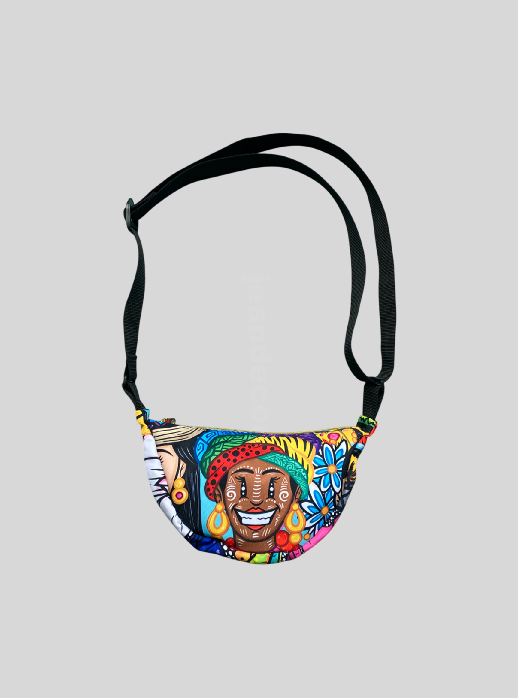 Esta cangurera presenta un diseño inspirado en la diversidad racial de las mujeres de Panamá, destacando a la mujer con turbante. Su estampado refleja la riqueza cultural y la identidad nacional, ofreciendo un accesorio práctico y cargado de significado para quienes valoran el arte y la historia. Ideal para llevar tus objetos personales con estilo y orgullo cultural.
