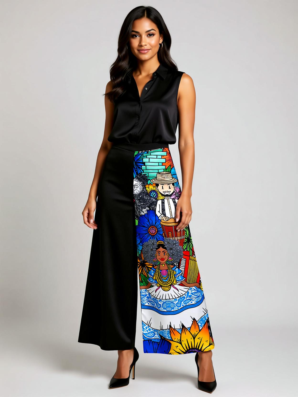 El pantalón Palazzo Esencia Panameña está diseñado con inspiración en las tradiciones culturales de Panamá, mostrando elementos característicos como la empollerada y el montuno. Esta prenda combina elegancia y calidad, ofreciendo un estilo sofisticado y cómodo que refleja la riqueza y el orgullo de la identidad panameña. Ideal para quienes valoran la moda con significado cultural y diseño distinguido.